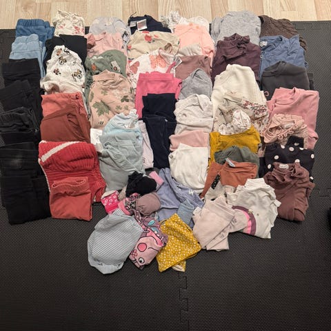 Klespakke med kjoler, shorts, t-skjorter mm. i str. 86-92. Den ene kjolen er i str. 80 men er veldig stor i størrelsen. Jenta mi brukte plaggene samtidig, så derfor størrelsene selges samlet. Tar forbehold om at det kan være noen bruksmerker som ikke har gått bort i vask, da en del av plaggene er brukt i barnehagen.