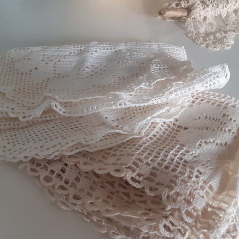 Fem vakre heklede, kniplede duker.