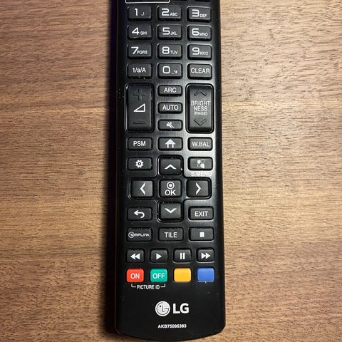 LG fjernkontroll i svart utførelse. Fjernkontrollen har navigasjonsknapper, volum- og kanalstyring samt egne knapper for meny og funksjoner. Passer til kompatible LG TV-modeller som bruker denne typen fjernkontroll. Drives av batterier (ikke synlig om de følger med).