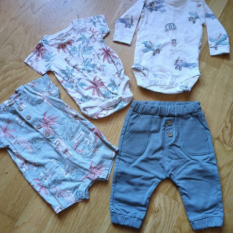 Newbie babyklær i størrelse 56. Selger en hvit omslagsbody med lange ermer og to bukser, en med rutemønster i beige toner og en lys blå🤍
