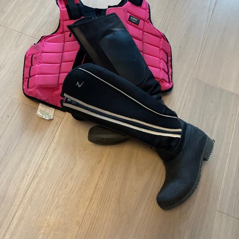 På bildene vises også et par svarte korte ridesko/rideboots med glidelås foran og elastikk i siden. Str 32