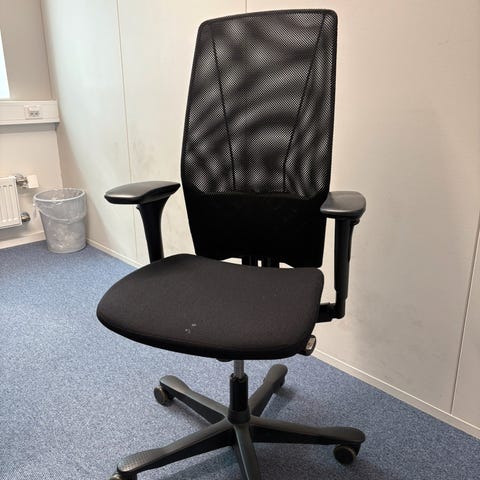 Den er pent brukt og i god stand. Det meste er regulerbart: høyde, armlener (høyde og vinkling), sete, rygg, nakkestøtte.