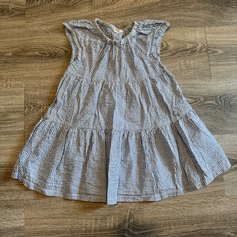 Noa Noa kjole for barn i størrelse 110/ 5-6 år. Kjolen er i rød- og hvitstripet bomull og er beregnet for jente. Den har stropper på skuldrene og lett, vevd stoff som egner seg godt til bruk vår og sommer. Passer til hverdagsbruk eller enklere penbruk.