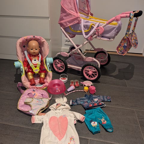 3 stk baby born selges sammen med køyeseng, stol, vogn og klær/utstyr. Det er to stk store, og en litt mindre baby.