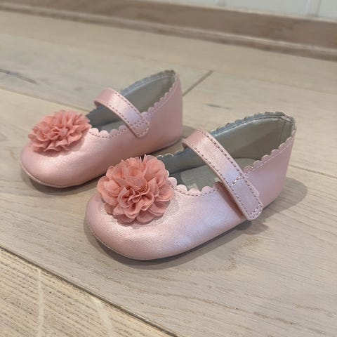 H&M ballerinasko for jente i lys rosa farge. Skoene har rem over vristen med borrelås og dekorativ blomst foran på tåpartiet. Yttersåle i syntetisk materiale. Egnet til bruk ved selskap, fest eller andre anledninger der pene sko ønskes.