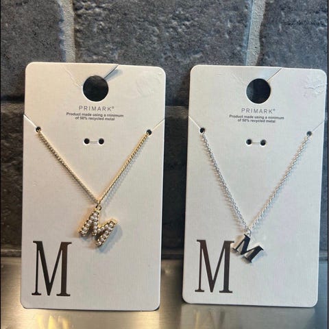 M smykke for dame i gullbelagt materiale. Smykket har flere små anheng i ulike former langs lenken. Passer til hverdagsbruk eller til enklere pynting. Laget i gullbelagt metall kombinert med andre materialer.
