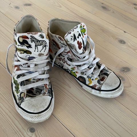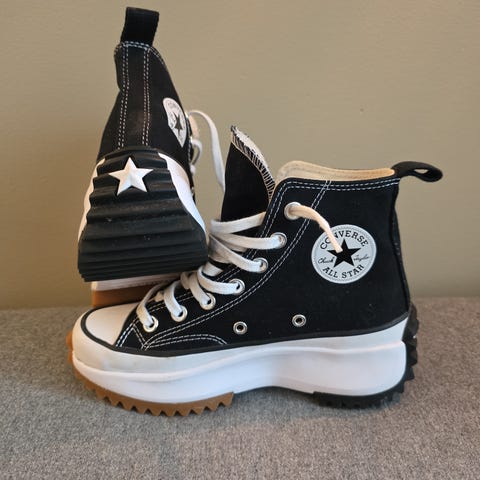 Converse høye joggesko til jente i størrelse 34. Skoene er i svart tekstil med hvit såle og hvite lisser. Modellen har grov yttersåle for godt grep og glidelås på siden i tillegg til snøring. Klassisk Converse-logo på ankelen. Egner seg til hverdagsbruk og fritidsaktiviteter.