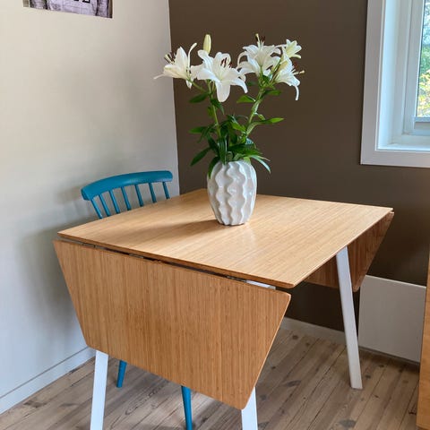 Pent brukt spisebord med oppbevaring, som kan slås ut. Må hentes i 3 etg