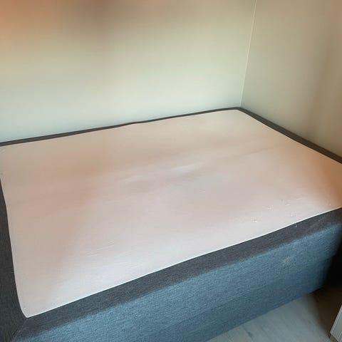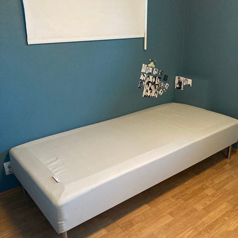 Seng fra Ikea, med 4 solide sengeben og en overmadrass, lite bruk. Lengde 210 cm, bredde 90 cm.