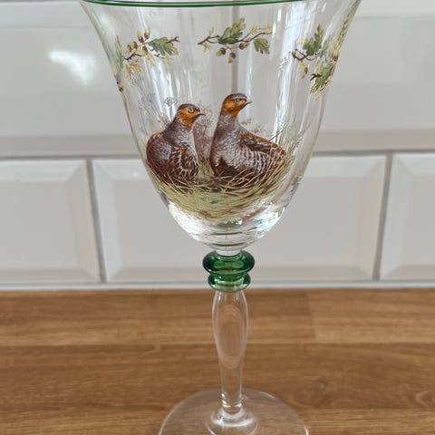 Et stk vinglass fra Firkløveren med villmark motiv. Designet av Christine Holm. Serien heter «Villmark». Glasset er i meget god stand.