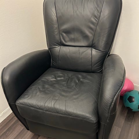 God å sitte i. Noe falmet i stoffet/fargen på armlenene . Trekk sydd bak nede på stol. Ellers hel og fin. Kan forekomme kattehår i stol selv om stol har teppe over seg. Se bilder