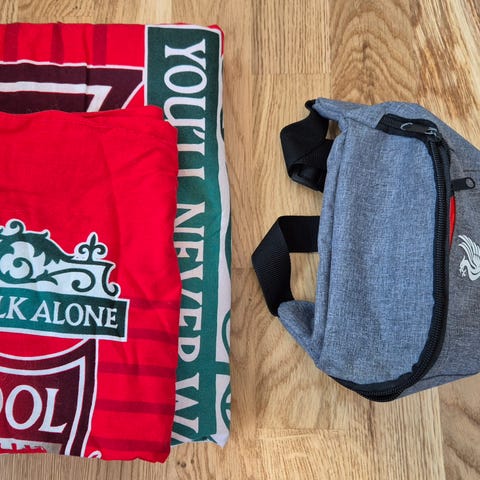 Liverpool pyntepute i rød farge med hvit strikket tekst «Liverpool You’ll Never Walk Alone» og to fuglemotiver. Puten passer som dekor i sofa, stol eller seng for personer som ønsker et supporterpreg i interiøret.