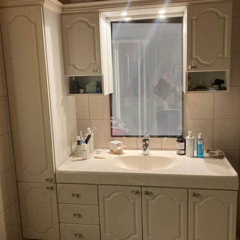 Baderomsinnredning av mærket Laufen pro i eik gis bort . Blandebatteri (Grohe) kan følge med mot liten tillegg Bredde på vask 1m , sideskap 130×35 og 90×35