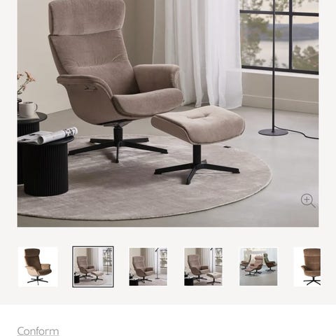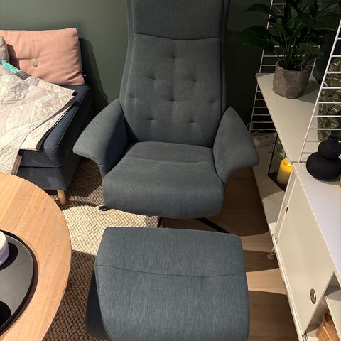 Vi selger en veldig pent brukt Timeout hvilestol med integrert fothviler. Den kan svinges 360 grader.