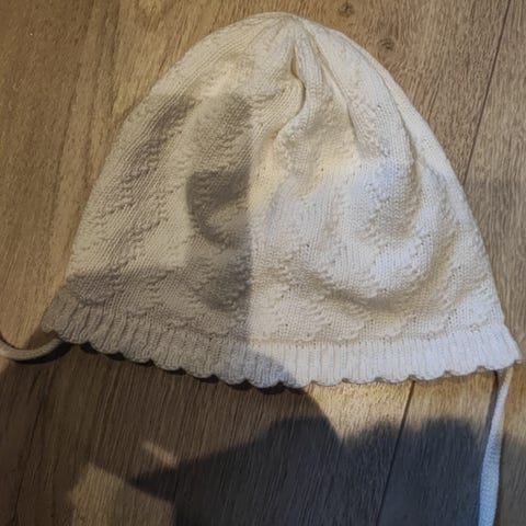 H&M lue til jente i størrelse 80. Luen er hvit og laget i bomull. Den har knyting under haken for bedre passform og en dekorativ blomst på siden. Passer til små barn rundt størrelse 80 og kan brukes som en lett lue i kjøligere vær.