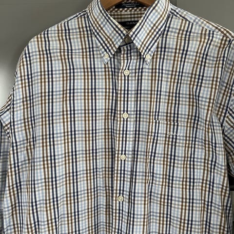 Gant skjorte for herre i størrelse XL. Skjorten er laget av bomull og har et rutete mønster i beige toner. Klassisk modell med krage, knappelukking foran og brystlomme. Egner seg til både hverdagsbruk og mer formelle anledninger.