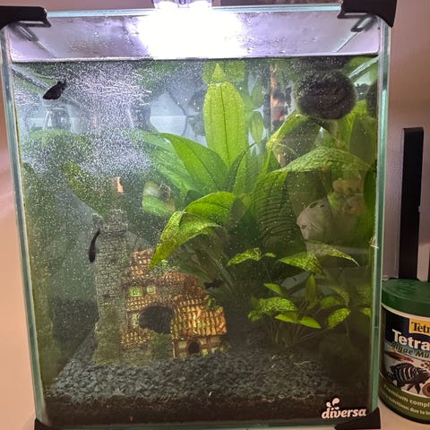 Selges med både pynt, sand, neon tretta og reker. Lokke (se bilde) måtte jeg lime den svarte saken som holder lokke oppe. Men det har ikke noe betydning for akvarium. Følger med mat og verktøy for å rense akvariumet.
