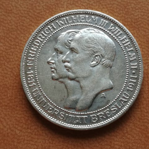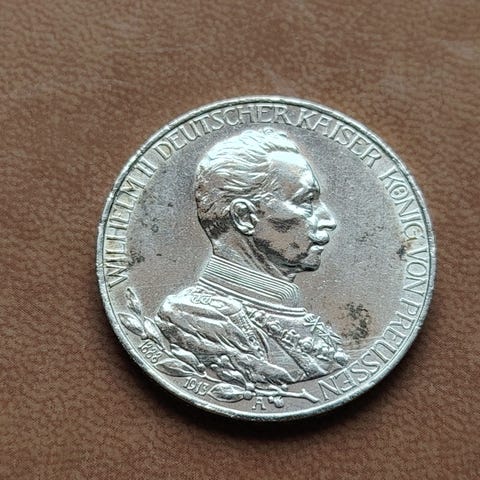 Selges prøyssisk 3 mark 1909 i fin stand for 450 kr. Kjøper betaler frakt.