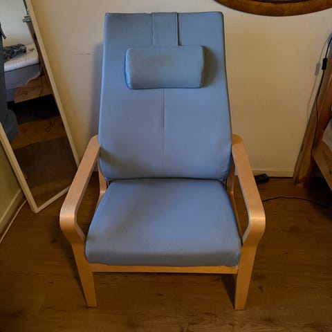 Høyrygget hvilestol og krakk m/trinnløs reg i Bjørk lyslakkert , Tekstil . Avtagbart stoff. Penbrukt, ingen synlig slitasje. Stolen er stødig og meget god stol.