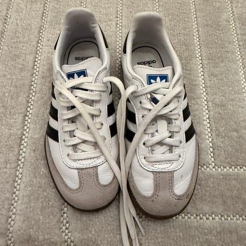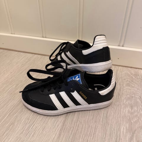 Adidas Samba joggesko for barn i størrelse 27. Skoene er hvite med mørke striper og detaljer, og har semsket parti foran på tåen. Yttersålen er i gummi med mønster for godt grep. Unisex-modell som passer til hverdagsbruk og fritidsaktiviteter.