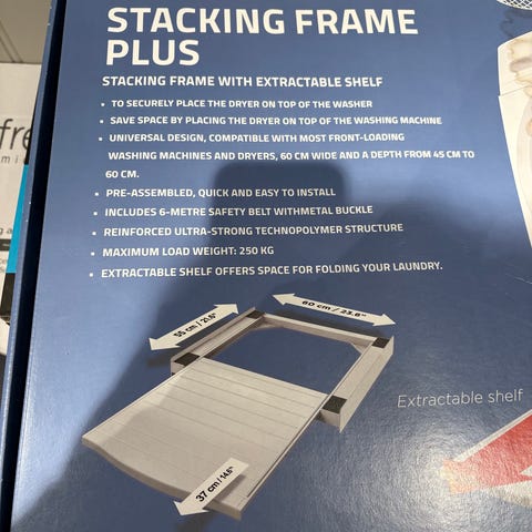 Praktisk kasse i stål med skuff til å sette vaskemaskinen oppå.