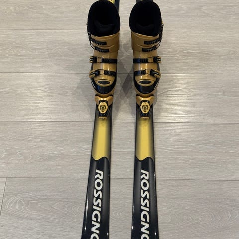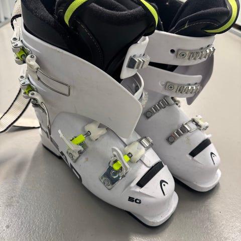 Head Project alpinstøvler i hvit plast med fire spenner i ulike farger og kraftig borrelåsreim øverst. Støvlene har høy skaft og justerbare metallspenner for tilpasning rundt fot og legg. Str. 250-255. Juniorstøvvel, flex 60. En del riper, men mye bruk igjen.