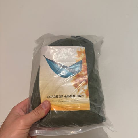 Helt ny og ubrukt. Hengekøye i blå og grå farge. Leveres sammenpakket i pose. Egnet til bruk utendørs, for eksempel i hage, på tur eller camping. Festemateriell følger med.