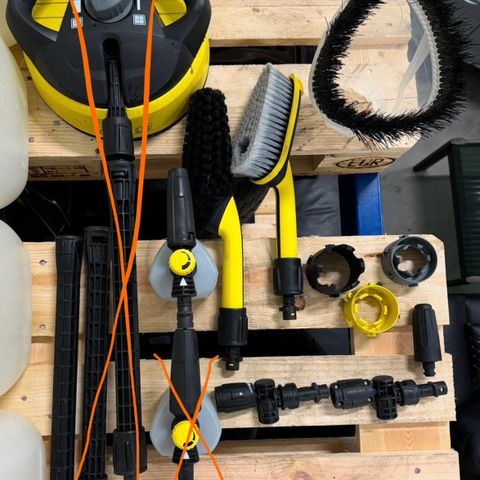 Kärcher HD 4/10 Plus Classic høytrykkspyler i grå utførelse. Enheten leveres med flere tilbehør, inkludert høytrykkspistol, ulike lanser og utskiftbare dyser med forskjellige spylevinkler. På toppen av maskinen er det integrert trommel for høytrykksslangen, og strømkabel kan vikles opp på siden. Høytrykkspyleren er egnet til rengjøring av uteområder, kjøretøy, fasader og annet utstyr der det er behov for høytrykksspyling.