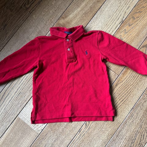Ralph Lauren genser for jente i størrelse 110. Genseren er rød og laget i bomull. Den har lange ermer, krage med knappestolpe foran og brodert logo på brystet. Passer til hverdagsbruk og kan brukes alene eller over en T-skjorte eller skjorte.