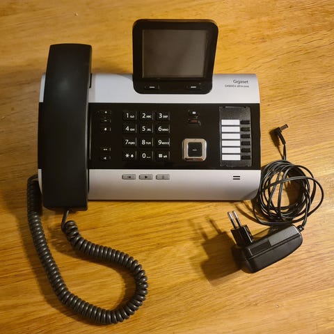 Aastra 6867i bordtelefon i svart farge. Modellen er en kablet IP-telefon beregnet for skrivebord, med numerisk tastatur, funksjonstaster og display. Telefonen har tilkoblingsporter på baksiden for nettverk og strøm, samt støtte for profesjonell bruk i kontor- og bedriftsmiljøer. Egnet som fasttelefon på kontorpult eller i resepsjon der det er behov for en stasjonær IP-telefon.