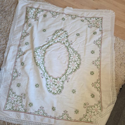 Vintage sengetrekk i lys bunnfarge med mønster i blå, rosa og grønne nyanser. 135 x195 cm. Klassisk blomstermønster med dekorative border langs kantene og rynket volang rundt hele teppet. Passer perfekt til redesign/ omsøm Stoffet fremstår som vevd bomull eller bomullsblanding med glatt overflate.
