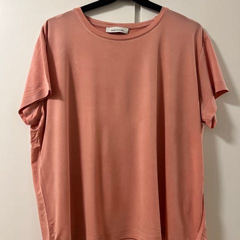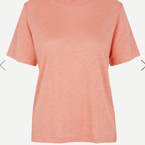 Samsøe Samsøe T-skjorte for dame i størrelse M. T-skjorten er rosa og laget av 100 % lin. Modellen har kort erm og rund hals. Passer til hverdagsbruk og kan kombineres med både bukser, skjørt og shorts.
