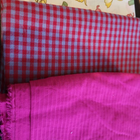 Selger diverse stoffer kjøpt på Husfliden. Antatt fra Solberg Spinderi. Mål og