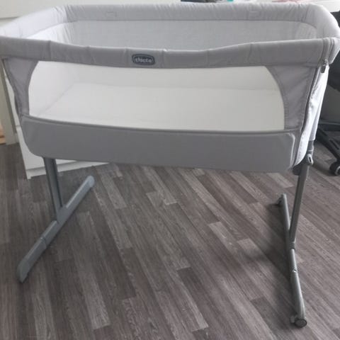 Pent brukt og solid babyseng som enkelt festes ved foreldresengen. Gir trygg og nær søvn for både baby og foreldre. Myk madrass følger med.