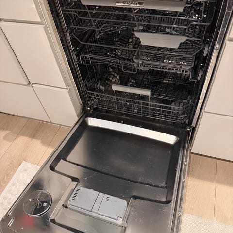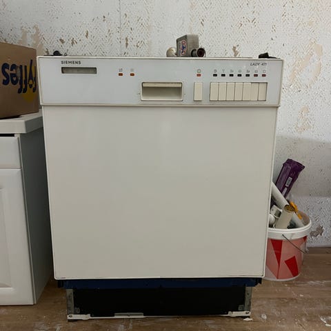 Oppvaskmaskin - kan slåes på og den tar inn vann, men døren er ikke sikker. Kan sikkert fikses.. vet ikke alder. Ikke vasket. Vil bli kastet hvis ingen vil ha.
