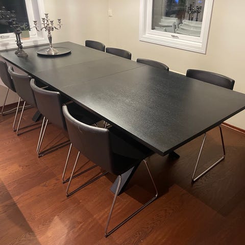 Pent brukt spisestue med 6 stoler med mulighet for justering fra 6 til 4 sitteplasser.
