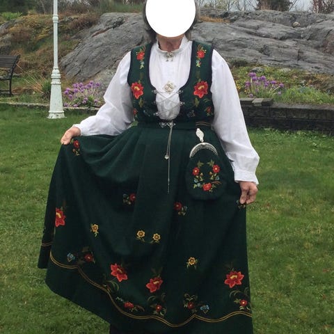 Denne bunaden er håndbrodert av min mor og jeg selger den for henne da hun ikke kan bruke den mer. Den er kun brukt 1 - 2 ganger i året, men har hengt i skapet de siste 15 årene. Størrelsen er en 40/42