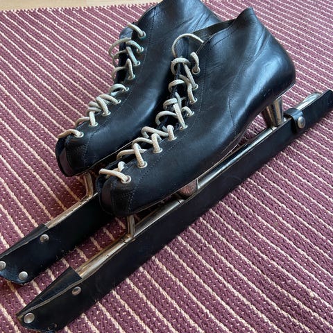 Helt nye, aldri utpakket eller brukt. Lengdeløpsskøyte med lav sko. Modellen har klassisk skinn sko med skolissefesting. Formentlig japansk produksjon.