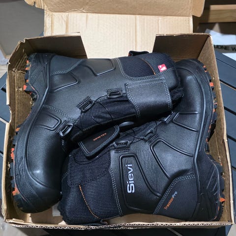 Helt nye Sievi vernestøvler i størrelse 42. Støvlene er svarte med kraftig yttersåle med mønster i svart og oransje. Overdelen er i slitesterkt materiale med borrelåsreim øverst og snøresystem med dreie-/strammehjul foran. Grovmønstret såle gir godt grep på underlaget. Egnet som arbeids- eller vernestøvler i ulike yrkes- og uteaktiviteter der det er behov for solide sko med beskyttelse og støtte rundt ankelen.