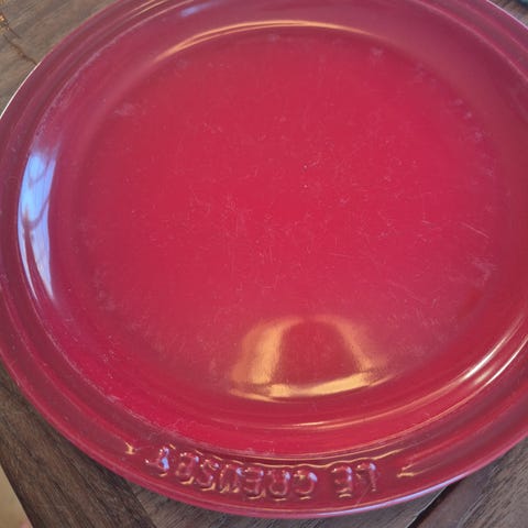 Selger 2 asjetter fra Le creuset i fargen marsielle. Fatene har bruksmerker, men ingen nag. Fatene er av gammelt design og er 23 cm.
