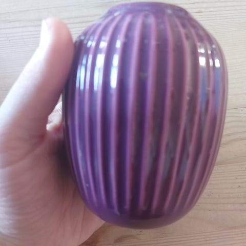 Kähler Omaggio vase i keramikk med horisontale striper i metallisk og hvit farge. Vasen har rund form med smalere åpning øverst, egnet til snittblomster, tørkede blomster eller som dekorativt objekt i interiøret. Undersiden er merket med Kähler-logo og designsignatur.