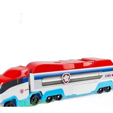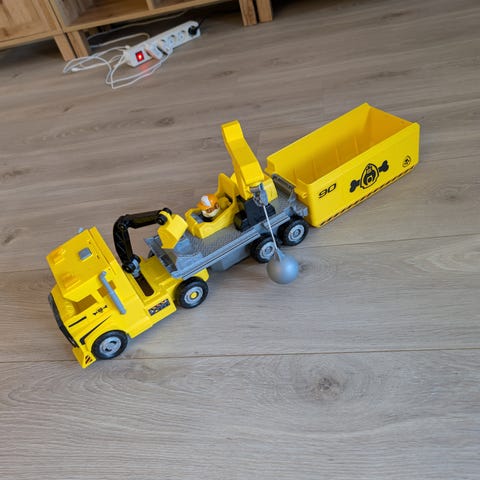 Selger Paw Patrol Rubble sin store arbeidsbil/lastebil i gul farge, med Rubble-figur som følger med. Kan brukes både som “lastebil” og åpnes til en mindre arbeidsbil med kran/krok, slik som vist på bildene – veldig gøy i leken!