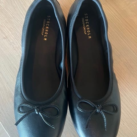 Stockholm Design Group ballerinasko i svart farge i størrelse 39. Modellen har rund tå med lakkdetalj foran og sløyfe på tåpartiet. Flat såle med lav hæl gir et enkelt og klassisk uttrykk. Passer til hverdagsbruk og enklere penere anledninger.