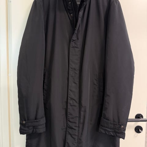 Dunfrakk fra Hetrego. Varm vinterfrakk, med avtagbart innerfor/«innerjakke». Lett nok til varmegrader, og tykk nok med fin du polstring til en kald vinter. Noen sømmer som bør forsterkes i ryggen, selges derfor billig. Fikset med tekstilteip som funker som bare det.