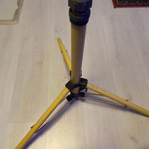 Justerbart teleskopstativ i metall med tre ben. Stativet har teleskoprør og låseklips for å regulere høyden. Farge oransje med svarte detaljer. Egnet som underlag for utstyr som krever stabil støtte, for eksempel måleinstrumenter eller lignende. Kan foldes sammen for enklere oppbevaring og transport.