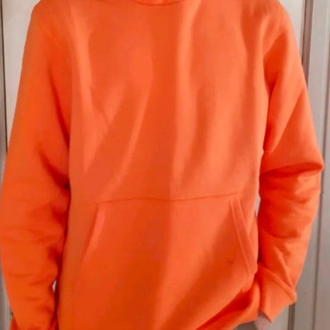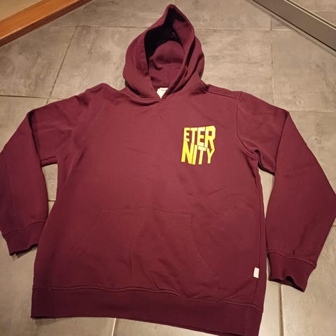 Selger en brukt hettegenser med tekst på brystet. Noen nupper og en bitteliten flekk på baksiden, ellers i god stand.