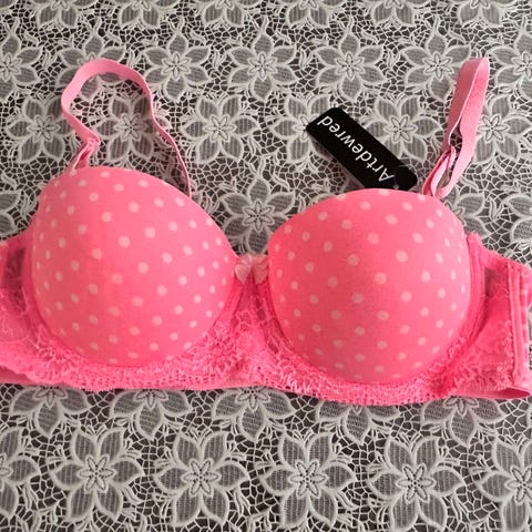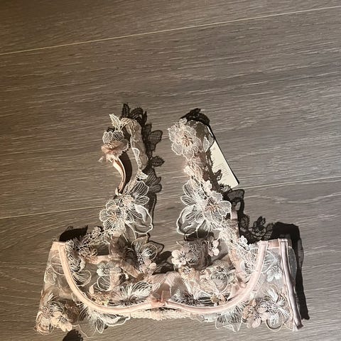 Helt ny og ubrukt blonde-BH fra Megan Barton-Hanson x Wolf & Whistle – et statement-plagg med tydelig edge og luksuriøs finish. BH-en har gjennomsiktige sorte blondekopper, bøyle for god støtte og en justerbar harness-detalj som gir et sensuelt, moderne uttrykk. Midt foran sitter en elegant gullfarget ring dekorert med perler – et karakteristisk og eksklusivt blikkfang.