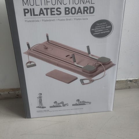 Pilatesbrett med strikker i rosa farge. Settet består av sammenleggbart brett med feste for strikker, to håndtak med polstret grep, en treningsmatte og en ekstra plate. Egnet til ulike styrke- og tøyeøvelser for hele kroppen hjemme eller på reise:)