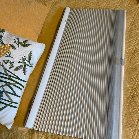 Gardinen er trådløs, betjenes med grep og kan skyves opp og ned til ønsket nivå – og blir stående i den posisjonen du velger.