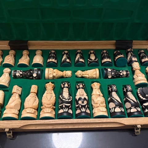 Sjakksett med håndlagde brikker i tre i mørk og lys brun farge. Brettet er i tre med lyst og mørkt rutenett. Brettet kan brettes sammen og fungerer som oppbevaringseske for brikkene, med polstret innside i rød tekstil. Komplett sett med to farger brikker, egnet til vanlig sjakkspill hjemme eller på hytta.